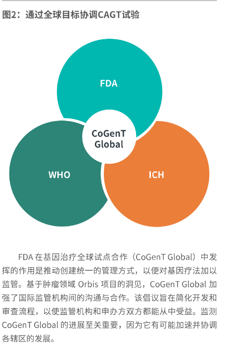 随着监管框架不断演变发展,申办方必须紧跟变化。此外,重要的是认识到FDA并非唯-一个正在塑造如此监管格局的机构。全球各地的监管机构正在通过WHO和ICH等平台开展合作,携手绘制CAGT监管工作的未来蓝图(图2)。这些国际合作对于营造具有凝聚力且可适应的监管环境而言至关重要,为CAGT创新格局提供了必要支持。