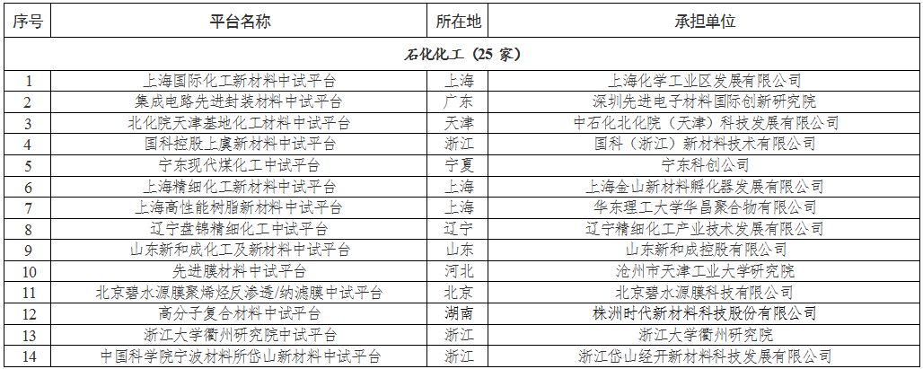 梳理名单,石化化工中试平台有25家,分别是上海国际化工新材料中试平台、集成电路先进封装材料中试平台、北化院天津基地化工材料中试平台、国科控股上虞新材料中试平台、宁东现代煤化工中试平台、上海精细化工新材料中试平台、上海高性能树脂新材料中试平台、辽宁盘锦精细化工中试平台、山东新和成化工及新材料中试平台、先进膜材料中试平台、北京碧水源膜聚烯烃反渗透/纳滤膜中试平台、高分子复合材料中试平台、浙江大学衢州研究院中试平台、中国科学院宁波材料所岱山新材料中试平台、辽宁沈阳化工新材料中试平台、松木岛化工新材料中试平台、氟氯高性能合成树脂及特种单体制备与应用中试平台、非粮生物质利用技术开发中试平台、山东绿色化工与新材料中试平台、辽宁大连洁净能源和精细化工中试平台、新能源新材料融合中试平台、新疆碳基能源绿色技术中试平、功能性膜材料研究开发和制造中试平台、鄂尔多斯现代煤化工中试平台、大连理工大学成都研究院高端化学品与聚合物中试平台。