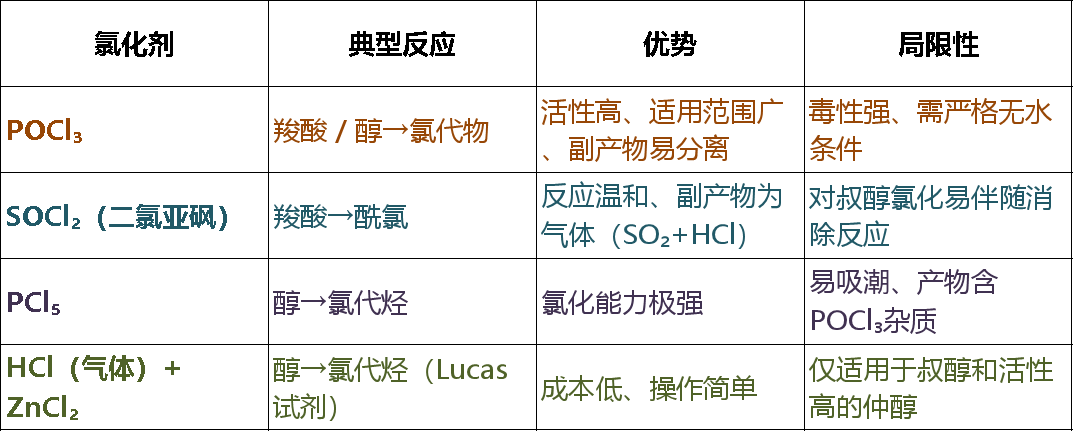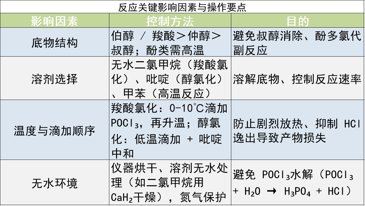 溶剂与催化剂:常用溶剂:二氯甲烷、氯仿、甲苯(极性非质子溶剂);碱性催化剂(如吡啶)可中和 HCl,提高反应速率(尤其适用于醇的氯化)。