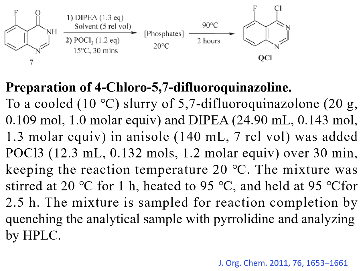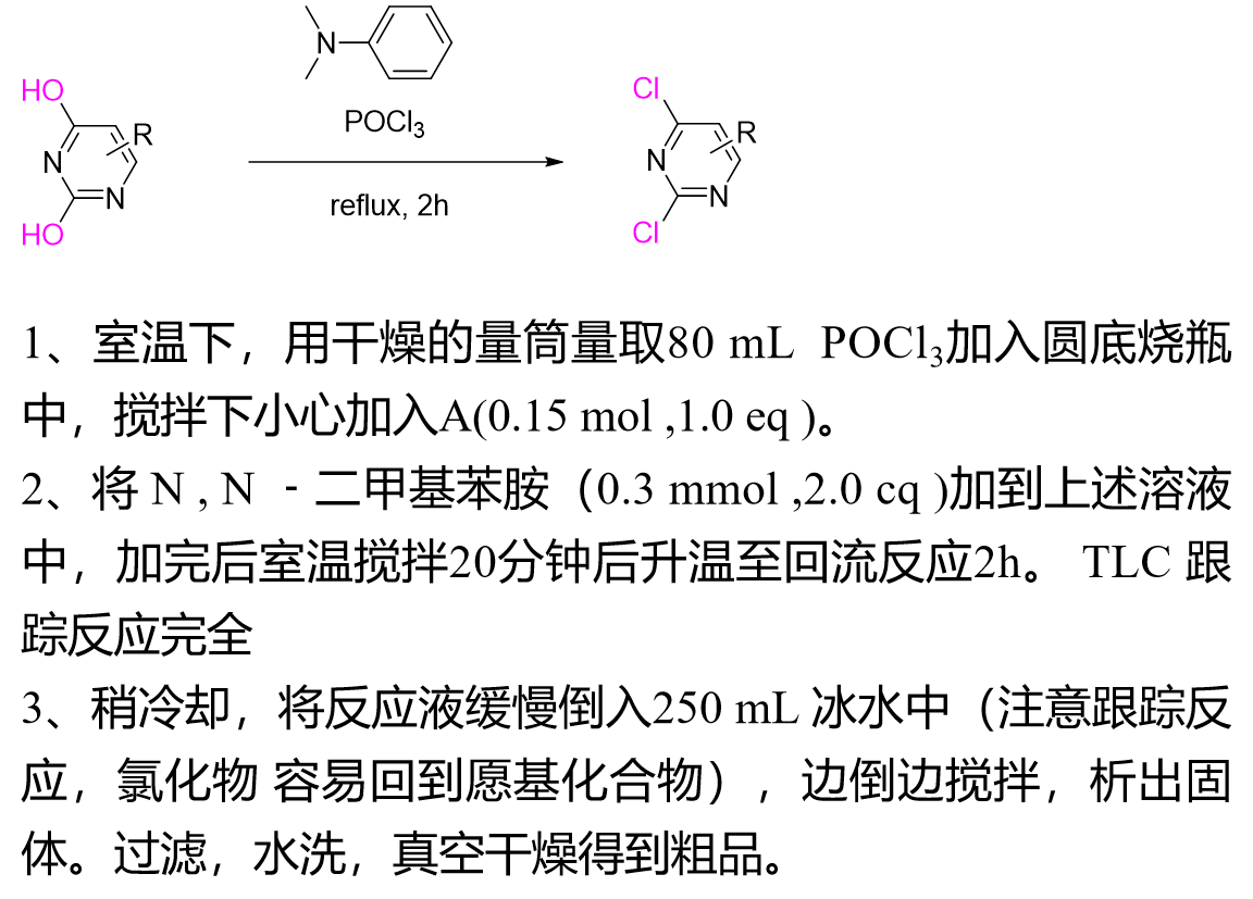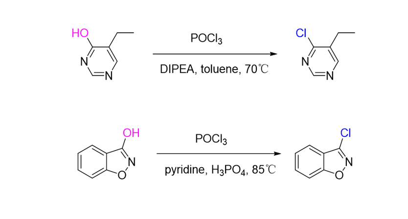 脱羟基氯化反应一般使用大大过量的POCl₃ 做溶剂,几克的小反应并没有太大问题,但当反应需要放大,做到公斤级,大量的POCl₃ 会造成后处理困难和安全隐患。因此,在放大反应时可以考虑加入其它溶剂(甲苯,氯苯等),此时,一般只需要加入1~2 eq 的 POCl₃ ,使得POCl₃ 的使用量大大减少。