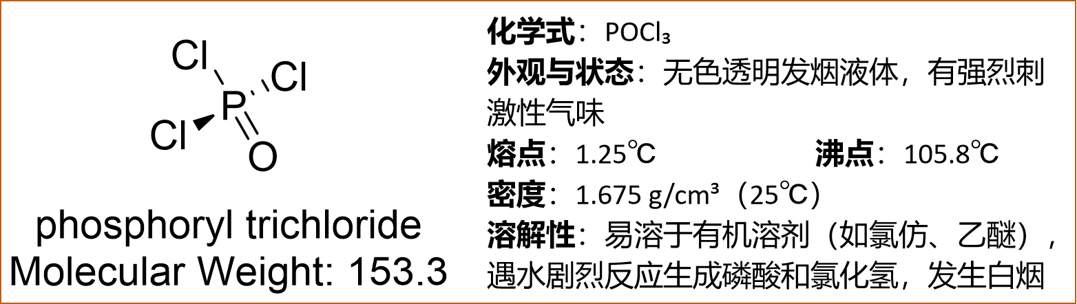 同时需要注意POCl₃遇水剧烈反应,与有机物接触可能引发燃烧;接触皮肤、眼睛会导致严重灼伤,吸入其蒸气可损伤呼吸道黏膜;LD₅₀(大鼠口服)约为 55 mg/kg,属于高毒物质。