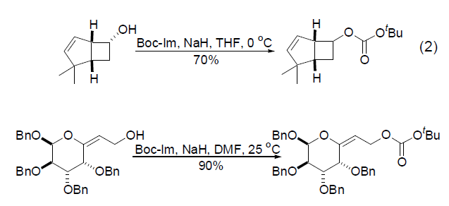 Boc-Im 与氨基反应生成叔丁氧基碳酰胺的反应很早就有所报道,但可能是由于有许多优秀的试剂可以来选择使用,所以该应用并不广泛[2]。但是,Boc-Im与醇羟基反应生成叔丁氧基碳酸酯的反应具有重要的合成价值。该反 应通常可以在室温下搅拌数小时即可完成 (式2,式3)[3~5],并且需要一个强碱KOH或者NaH作为催化剂。