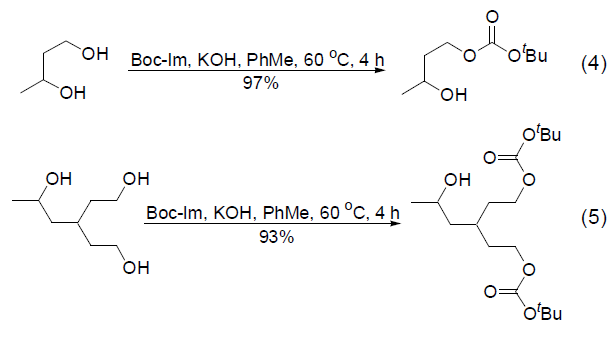 Boc-Im 与含有多羟基底物反应具有高度的选择性,可以在仲醇的存在下选择性地与伯醇反应。即使在提高反应温度的情况下,该选择性也几乎不受到影响 (式4,式5)[1,6]。