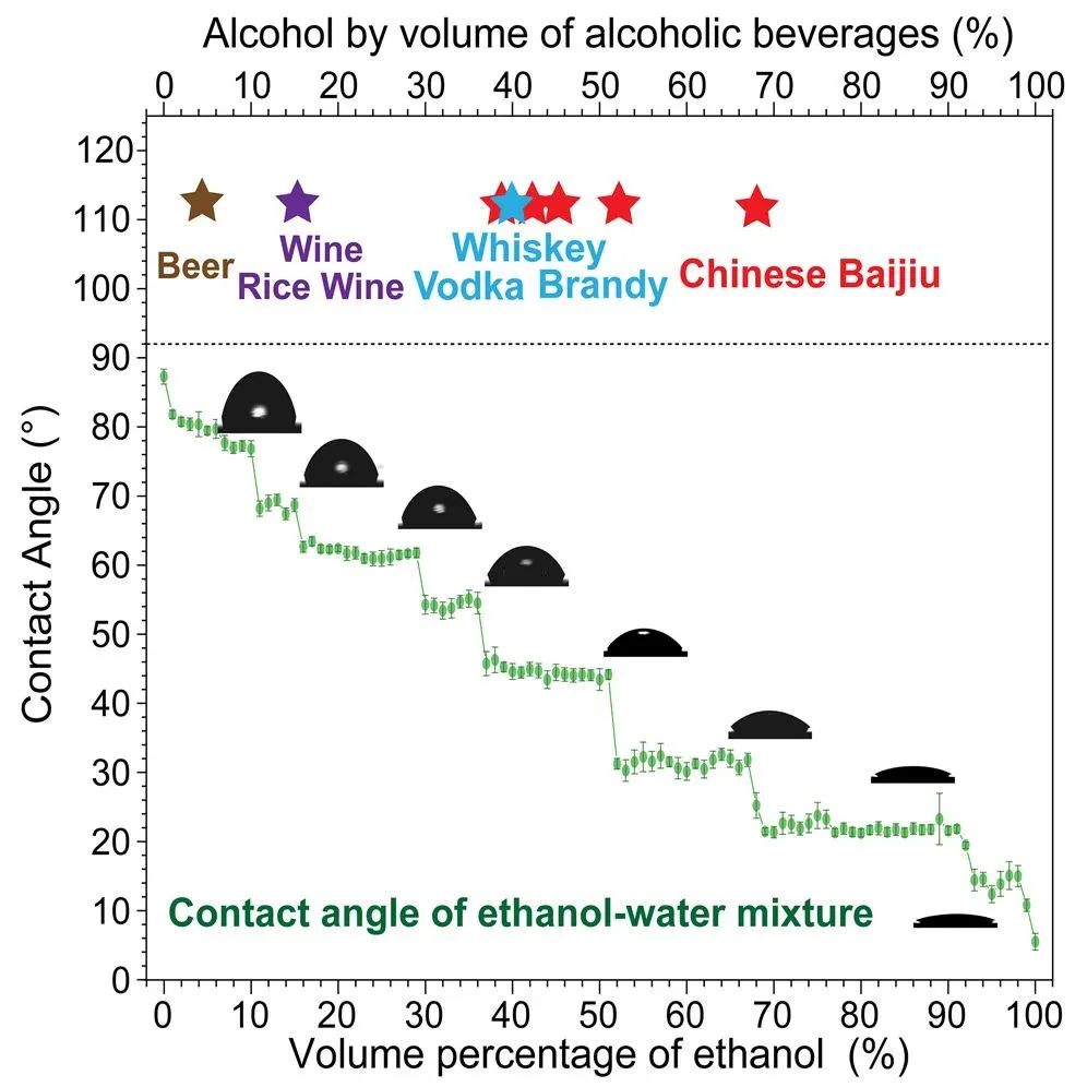 针对这一问题,江雷与同事将那些乙醇-水溶液放在疏水表面——高定向热解石墨(highly oriented pyrolytic graphite, HOPG)上,以测量表面张力。液体在固体表面上会形成液滴,可能是扁平状,也可以是圆球状,这主要取决于表面张力,而接触角是测量表面张力的常用方法。他们发现,随着酒精度增加,乙醇-水溶液在该疏水表面上的接触角并没有随着酒精度增加而线性增加。但总的来说,酒精度越高,乙醇-水溶液的液滴接触角越小,表面张力也越小,液滴便趋于扁平状,甚至可能铺散开来。