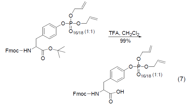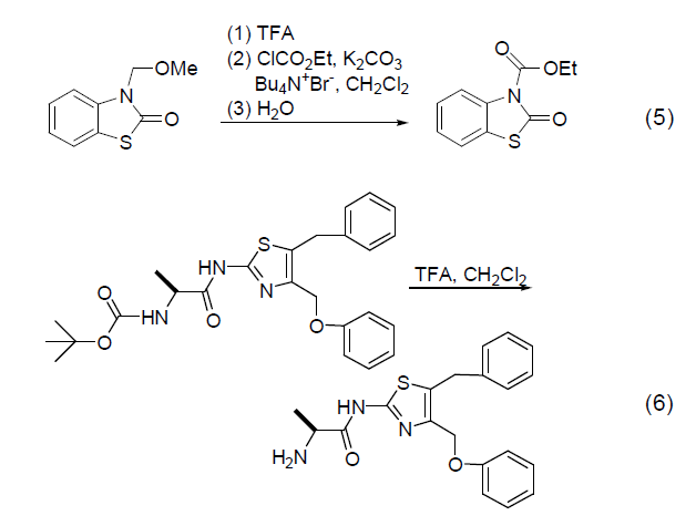 的化学基团(如氨基、羟基等),常常需要利用一些保护基团对其进行保护。三氟乙酸可以比较方便地脱去氨基、羟基的保护基团[5],例如,N-苄氧羰基、N-甲氧甲基 (式5)、N-叔丁氧羰基 (式6)[9]、O-叔丁氧羰基 (式7)[10]、N-苄氧甲基等。