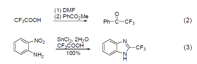 三氟甲基是亲脂性好,电负性强的基团,它在生物活性分子中具有特殊的作用。利用三氟乙酸可以在一些化合物分子中引入三氟甲基(式2,式3)[6,7]。