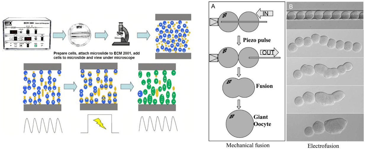 电融合是基于细胞在电场中的极化现象。当细胞置于电场中时,细胞会极化成偶极子,并沿着电力线排列成串状结构。随后,通过施加高强度、短时程的电脉冲,细胞膜会发生瞬间的击穿,这种击穿是可逆的。在细胞膜的高电导状态期间,相邻细胞的膜结构可以相互融合,从而实现细胞融合。