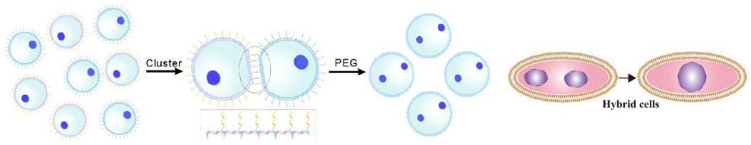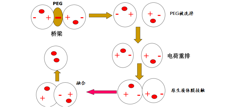 PEG分子带有大量负电荷,这些负电荷与细胞膜表面的负电荷在Ca²⁺的桥接作用下形成静电键,从而促进不同来源的细胞膜之间的黏附和结合。