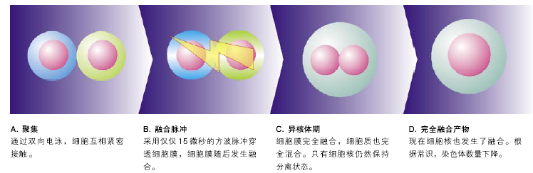 刚完成电融合的细胞可以被称为异核体。这是因为尽管细胞膜已经在表面发生了融合,但在细胞内部仍然可以观察到两个或多个细胞核。随后,这些细胞核会在细胞内部逐渐发生融合。在大多数情况下,这一过程会导致细胞核中染色体数量的显著减少。