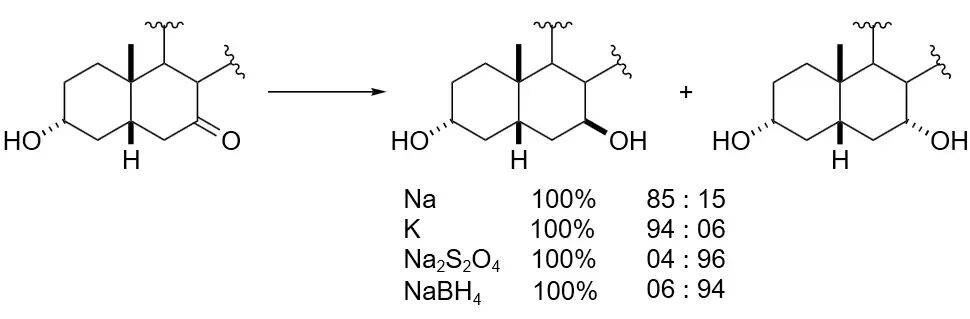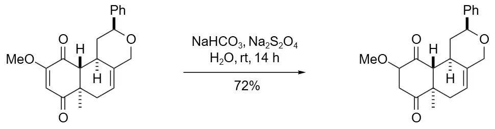 在苯-水混合溶剂中以 Adogen 为相转移催化剂,连二亚硫酸钠可以将 α,β-不饱和羰基化合物还原成为相应的饱和羰基化合物。孤立的碳-碳双键不受影响,没有检测到醇的存在。