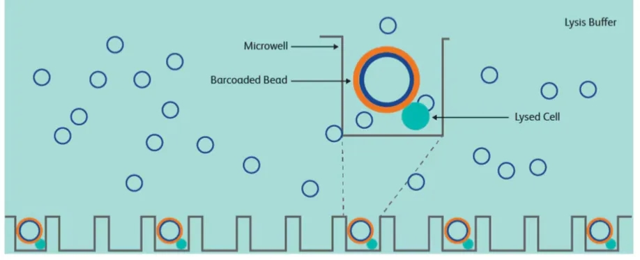 首先,将单个细胞与一个含有建库所需酶的微珠(bead)包裹在一个纳米级的液滴中。每个微珠(bead)都携带有一段独特的条形码序列(barcode),这段序列会被添加到该液滴中细胞的所有转录本序列上,从而能够区分不同细胞的转录本。