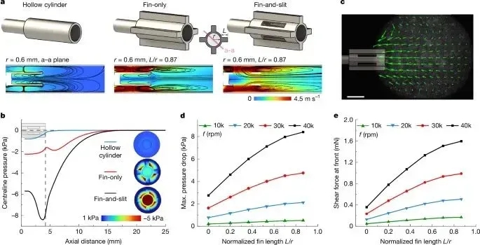 通过CFD仿真对比三种Milli-spinner结构设计:空心圆柱体、纯鳍片结构及鳍片-缝隙复合结构。优化研究表明,复合结构在3mm管径内旋转时可产生最优流体动力学效应,其独特的鳍片-缝隙协同作用能同时增强负压吸附和剪切力生成,实现血栓的高效机械压缩与结构重构。该设计突破使血栓清除效率提升至新水平。
