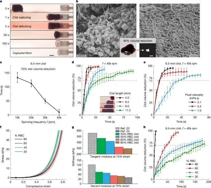 图3展示了Milli-spinner体外血栓清除性能的系统评估:A) 2.5mm装置在3mm管径内10,000rpm下可有效清除6.5mm血栓;B) SEM证实其显著破坏血栓结构(n=20);C) 转速提升至40,000rpm时,70%体积清除时间缩短83%;D) 血栓长度增加导致效率下降;E) 流体粘度7.0mPa·s时效率降低42%;F-H) RBC含量影响血栓刚度(与临床样本吻合)及清除效率,80%RBC血栓清除效果最优。所有实验均重复3次验证。