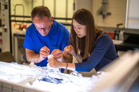 赵芮可教授与Jeremy J. Heit教授在人体循环系统模型演示毫微旋转器植入