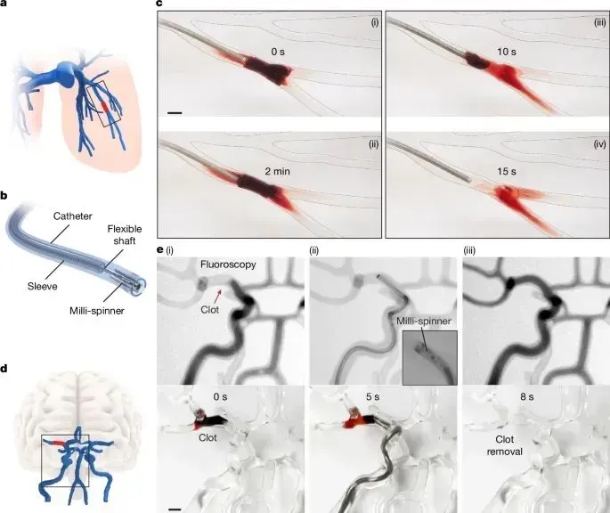 这项突破性研究于2025年6月4日刊登于《Nature》,论文题为"Milli-spinner thrombectomy"。研究团队由斯坦福大学机械工程系主导,常一隆博士担任第一作者,赵芮可教授负责通讯指导。吴帅博士(2019-2024届)作为第二作者参与研究,医学院放射科Jeremy J. Heit副教授等学者共同完成了此项工作。