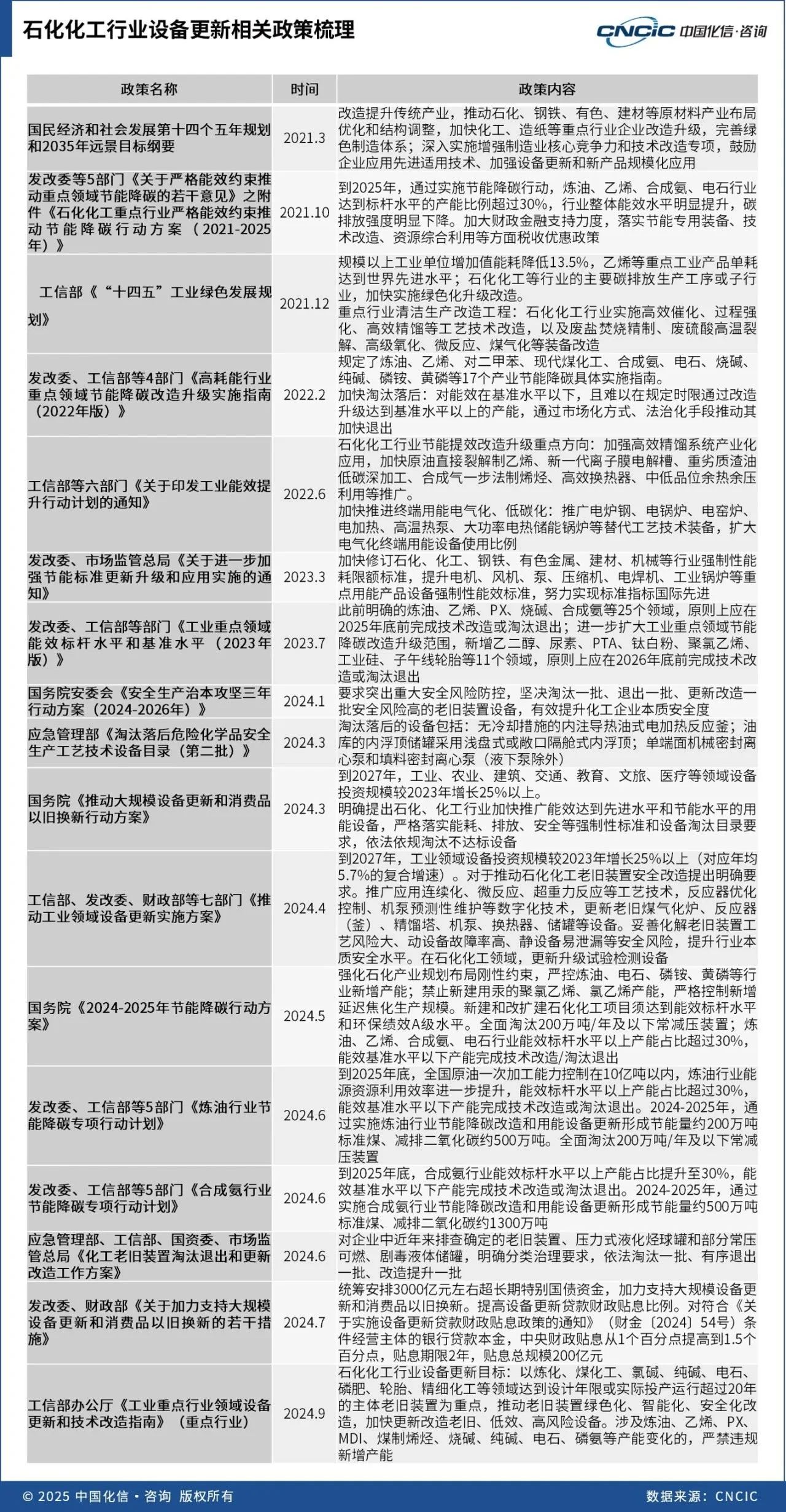 《指南》中明确了石化化工行业设备更新目标:以炼化、煤化工、氯碱、纯碱、电石、磷肥、轮胎、精细化工等领域达到设计使用年限或实际投产运行超过20年的主体老旧装置为重点,推动老旧装置绿色化、智能化、安全化改造,加快更新改造老旧、低效、高风险设备。