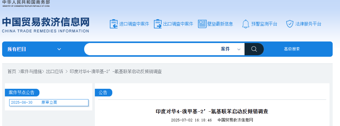 2025年6月30日,印度商工部发布公告称,应印度生产商Neogen Chemicals Ltd.申请,对原产于或进口自中国的4-溴甲基-2’-氰基联苯[4-(Bromomethyl)-2'-cyanobiphenyl/BromoOTBN]启动反倾销调查。本案涉及印度海关编码29269000、29339990、29332990、29420090和29152990项下的产品。