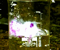 原理:碘单质与金属铝的粉末混合,并加入少量水即可引发剧烈反应。主要反应式:2Al(s) + 3I2(s) → Al2I6(s),水在其中起到催化剂的作用。随着反应进行,碘单质也会升华形成紫色的碘蒸气。