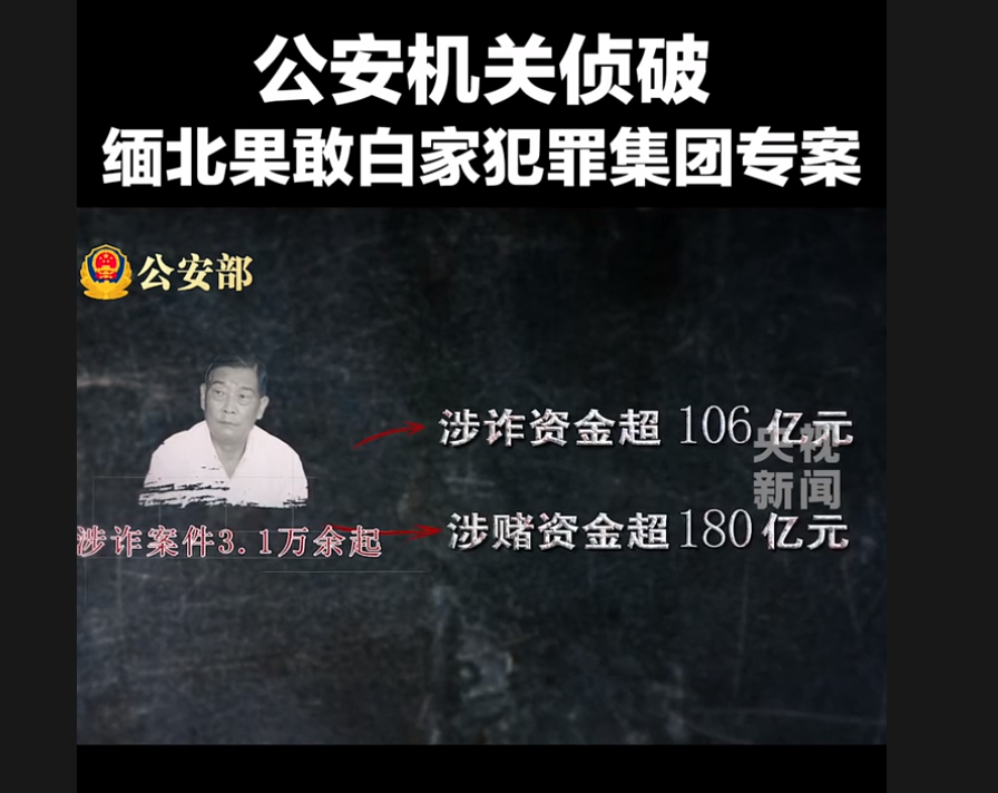 公安机关经侦查查明,以白所成、白应苍为首要分子的缅北果敢白家犯罪集团涉嫌诈骗,故意杀人,故意伤害,绑架,敲诈勒索,开设赌场,组织他人偷越国(边)境,组织、强迫卖淫以及贩卖、制造毒品等多项罪名,致我国公民6人死亡,涉诈案件3.1万余起,涉诈资金超106亿元,涉赌资金超180亿元,制造并贩卖毒品约11吨。