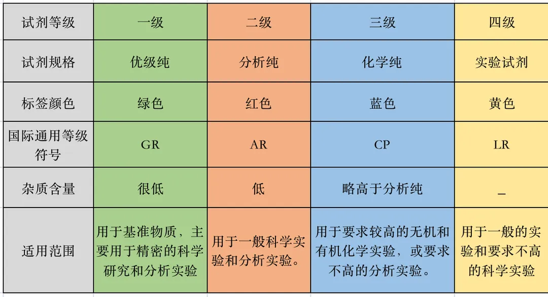 1. 化学试剂规格基本上按纯度(杂质含量的多少)划分,共有高纯、光谱纯、基准、分光纯、优级纯、分析和化学纯等7种。国家和主管部门颁布质量指标的主要优级纯、分级纯和化学纯3种。