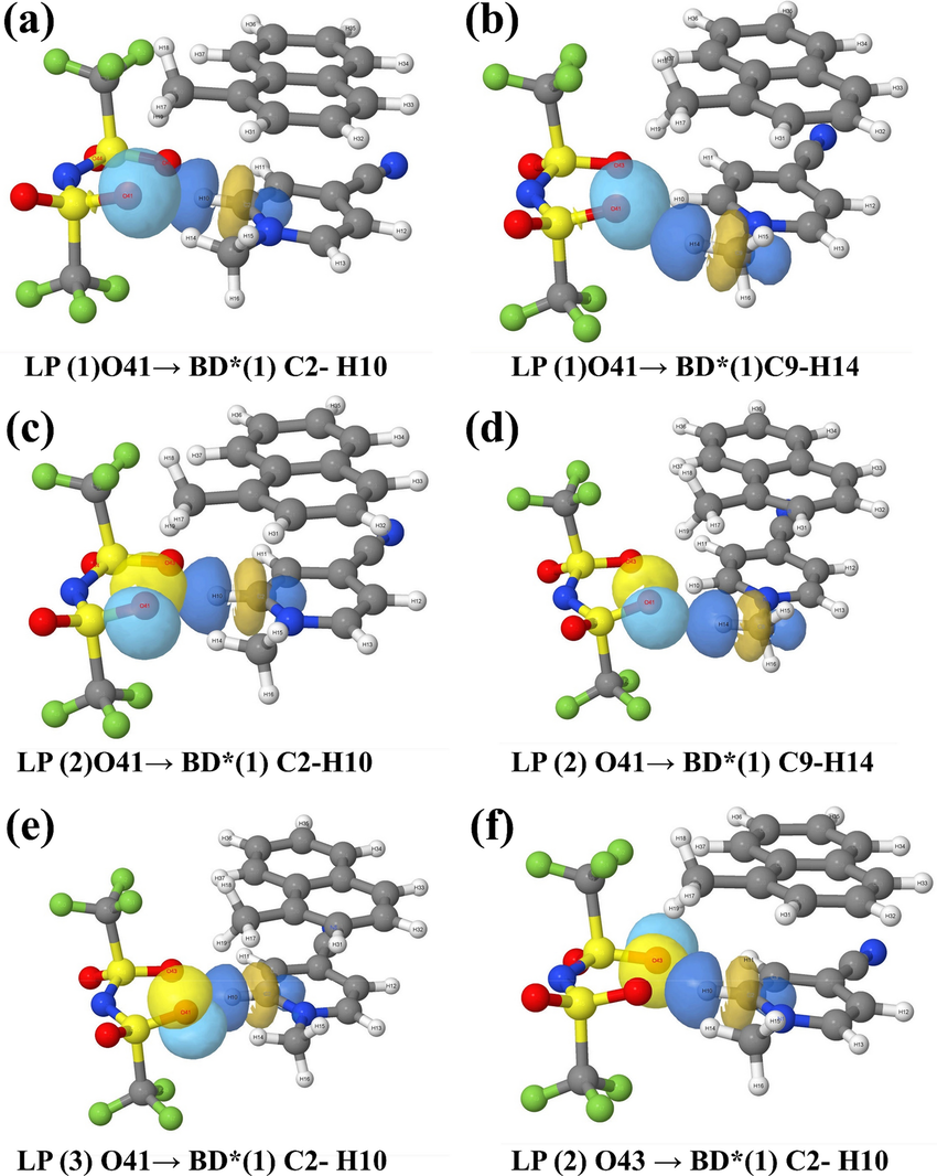 在氢键体系(表示为D-H···A,D为氢供体,A为氢受体)中,NBO分析可以清晰地揭示氢键的轨道相互作用本质。这种相互作用主要表现为氢受体A上的孤对电子(lone pair, LP)轨道向氢供体D-H键的反键轨道()发生电子转移。