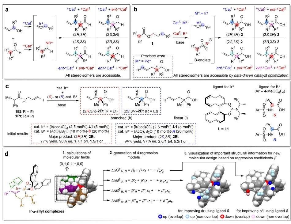 通过分子场分析(MFA)和回归模型,研究者能够从三维分子结构中提取关键的结构信息,并将其可视化,从而指导手性催化剂的优化设计。具体而言,研究团队利用Ir-π-烯丙基中间体的结构作为描述符,通过计算分子场(如立体指示场)与反应选择性(如构型选择性和非对映选择性)之间的定量关系,构建了多个回归模型。