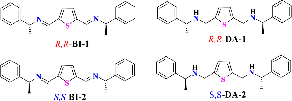 具体到本文研究的手性双亚胺(R,R-BI-1和S,S-BI-2)及其还原产物手性二胺(R,R-DA-1和S,S-DA-2),MESP分析揭示了这些分子中苯环和噻吩环的电势分布差异。这些差异不仅影响分子在晶体中的堆积方式(如形成二维螺旋结构),还可能影响它们与生物大分子(如TNFα受体)的相互作用。例如,R,R-DA-1与TNFα受体的结合能较高,可能与其特定的电势分布和由此产生的非共价相互作用有关。通过对比手性对映体的MESP图,可以进一步研究手性中心对分子整体电子分布的影响,从而为手性药物的设计提供理论依据。
