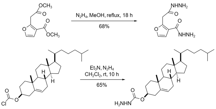酯、酰卤、酰胺和肼反应可以形成有用的合成中间体酰肼。酰肼与亚硝酸作用产生酰基叠氮化合物,经加热生成异氰酸酯(可进行 Curtius 重排)或与五氯化磷反应得到二氯化或三氯化产物。