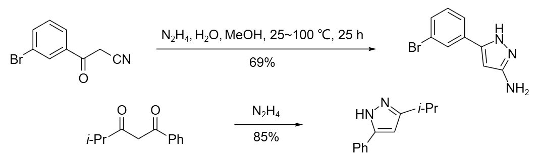肼与含羰基或腈基的化合物反应得到杂环化合物。例如:肼与 β-羰基丙腈回流可生成氨基吡唑。同样,肼与 1-异丙基-3-苯基-1,3-丙二酮反应生成吡咯衍生物。