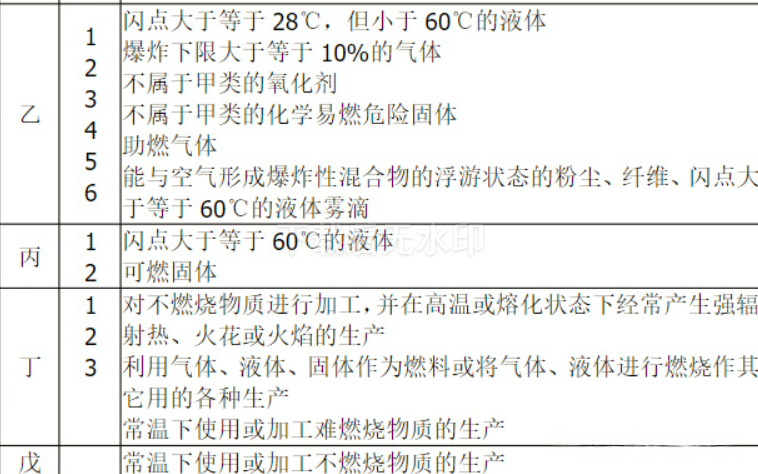乙类:28≤闪点<60的液体、自燃物品;爆炸下限=>10%的气体;